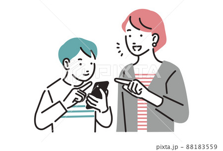人物 スマホデビューした男の子に操作方法を教えるお母さん
