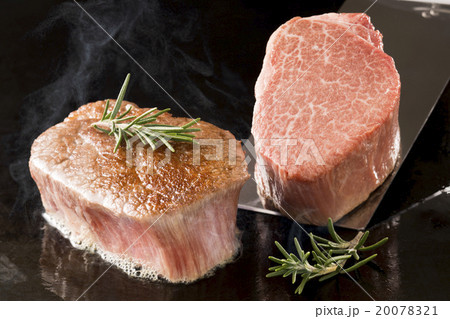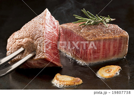 注意)湯気はレタッチ合成です。黒毛和牛のフィレ肉、ヒレ肉のステーキ。ステーキ肉、ビーフ、牛肉。