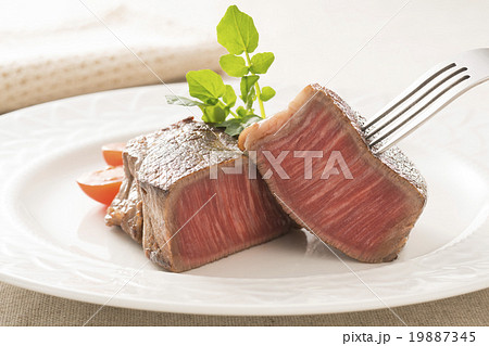 皿盛りした黒毛和牛のヒレステーキ肉「白背景」