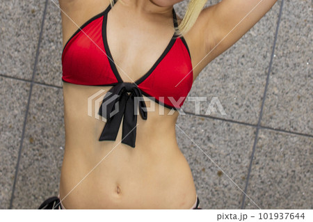 赤いビキニを着たスレンダーな女性の胸とお臍