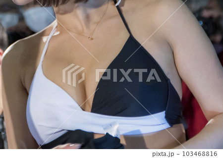 カラフルな衣装を着たキャンギャルの大きな胸の谷間