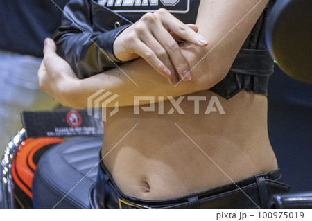 大胆におなか回りが見える衣装を着ている女性のお腹