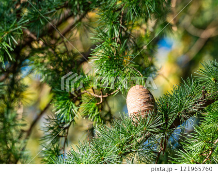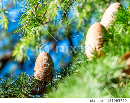 樹の上にちょこんと座る小人の様なヒマラヤシーダーの松ぼっくり