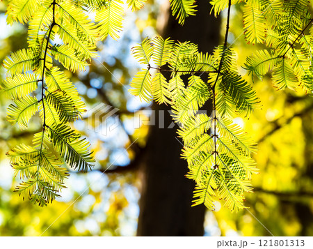秋の陽に黄金色に輝くメタセコイアの美しい葉