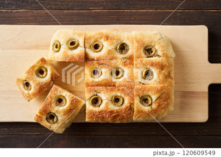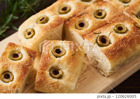 オリーブとローズマリーを乗せて焼いたフォカッチャ