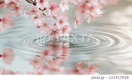 雨の光が宿る濡れた桜の花びらと淡いピンクの.