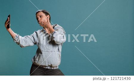 Silly confident woman recording a video while she shows groovy dance moves, filming on her smartphone and fooling around in studio. Funky bold edgy person being funny. Camera B.