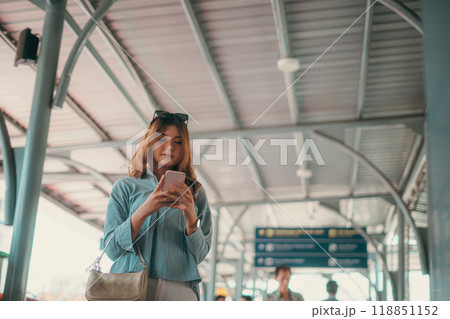 Young Woman Using Smartphone at Urban Station with Passengers in Background