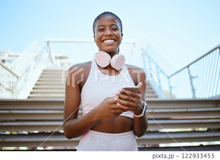 Fitness, music and phone with black woman by stairs for streaming service or social media while exercise, workout or training. Mobile, wellness and portrait of girl with headphones for sports
