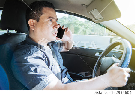 Concept of man calling on the phone while driving, A man driver calling on the phone in his car, Close up of a young man sitting inside car using mobile phone