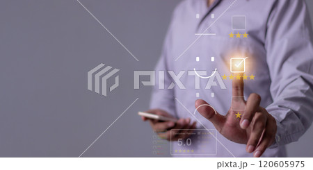 Customer review satisfaction feedback survey concept. Person giving a five-star customer satisfaction rating on a smartphone, implying excellent service quality. User experience online application.