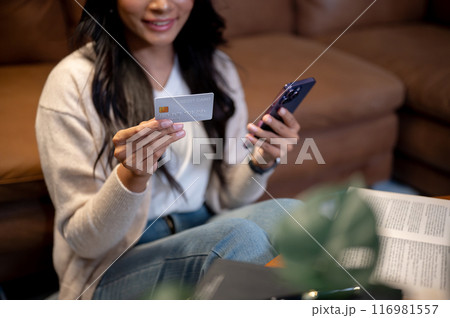 Cropped image of an Asian woman is holding a smartphone and a credit card, sitting in a living room.