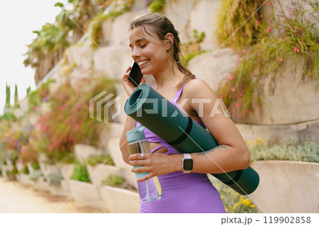 An Active Young Woman is Engaged in a Conversation on Her Phone After Completing a Yoga Session