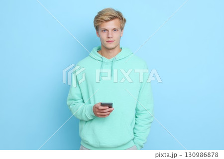 Young man with phone against blue background. Casual style for social media or chatting themes, perfect for modern or tech designs. Ideal for digital or youth visuals.