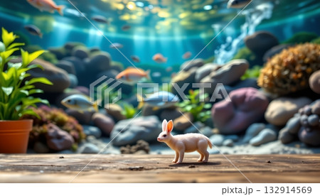 An underwater themed room with a small white bunny standing in front of a coral reef diorama filled with rocks, plants, fish