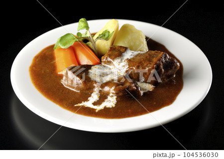 クレソン、人参、ジャガイモの付け合わせと生クリームがけ厚切り牛タンの熱々ビーフシチューを黒背景で撮影