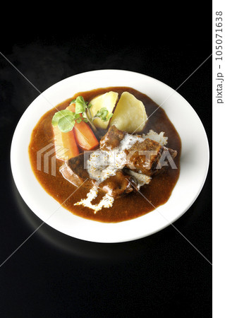 ブロッコリー、人参、ジャガイモが付け合わせてある厚切り牛タンのビーフシチューを黒背景で撮影