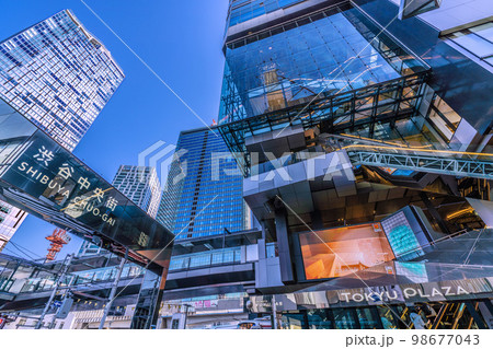 日本の東京都市景観 ウェーブ通りから、京王井の頭線渋谷駅や夕日を浴びる渋谷ヒカリエなどビル群を望む