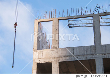 Concrete building under construction with crane and visible framework. Architecture, engineering, and urban development process in progress within a modern residential project.