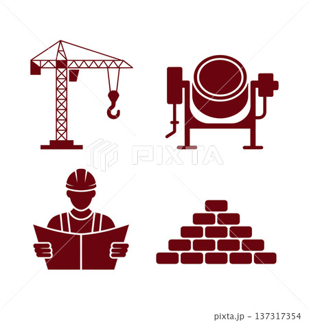construction site silhouette collection with crane with hook, cement mixer, male construction worker reading blueprints, and brick stack