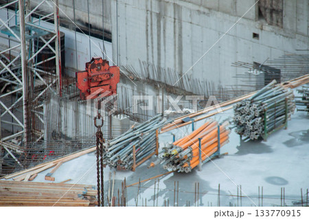 Red Rusty Hook suspension Tower Crane against background Warehouse of Yellow Volumetric I-Beams Formwork on Roof Monolithic Building Box. Background Construction Site with Rebar outlet Concrete Walls.