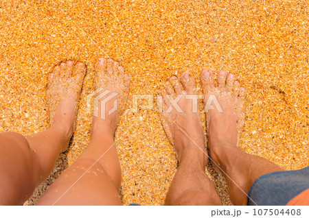 Top view from a couple standing on the sand, romantic. Love story. Female and male legs stand side by side on the sandy beach first person view