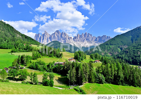 Panoramic view of mountainous green valley village in summer near Valley of Funes at Dolomites, Italy