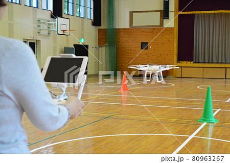 体育館でドローンのフライト訓練をする