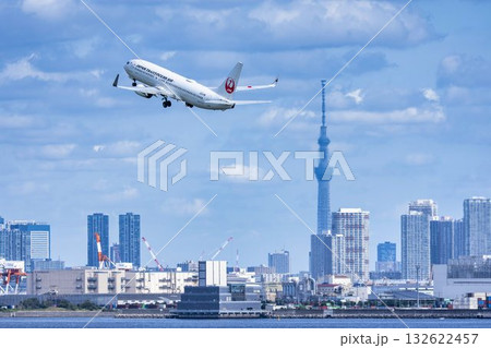 羽田空港の風景 離陸中の飛行機と東京スカイツリー 東京都大田区