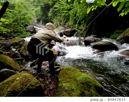 フライフィッシングで雨降る中の源流を釣り遡る