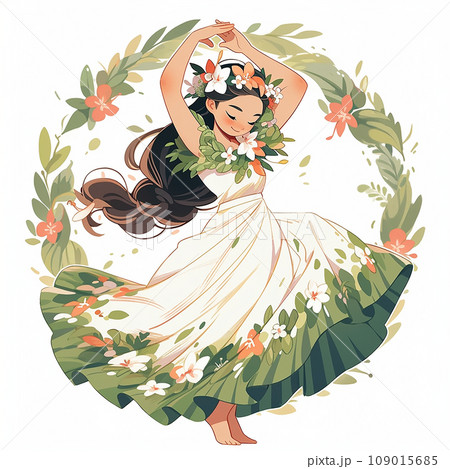 プルメリアをつけたフラダンスを踊るハワイアンフラガール