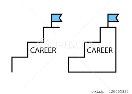 ビジネスのゴールイメージ、階段とゴールの旗のシンプルな線画イラスト、アイソメトリック