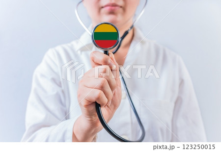 Female doctor holding stethoscope with Lithuania flag. National health system of Lithuania
