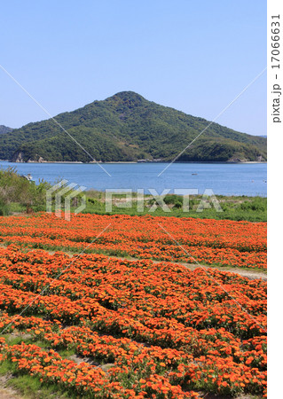 香川県三豊市 荘内半島、市営花畑「フラワーパーク浦島」のキンセンカと「粟島」