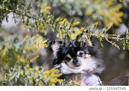 満開の桜並木と菜の花 2匹のロングコートチワワ 春の素材