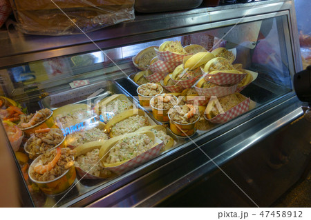 Sandwiches with crab, shrimp and seafood for sale at fishermans wharf