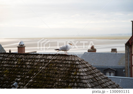 モンサンミッシェルの屋根に止まるカモメと干潟の風景