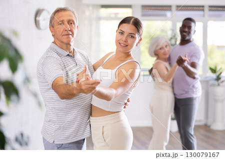 Happy pretty woman enjoying ballet dance movements with male partner in ballet room during class. Social dancing concept