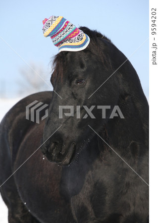 Funny black horse with winter hat