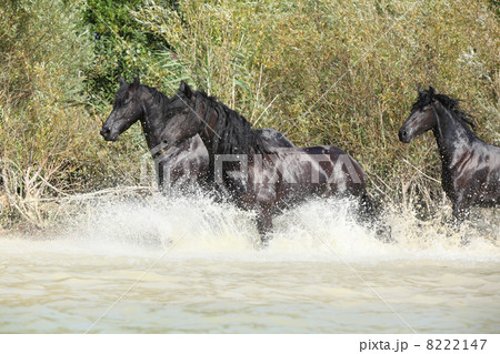 Group of friesian mares in the water