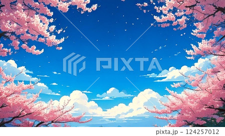桜の枝と快晴の青空 背景フレームイラスト AI生成素材