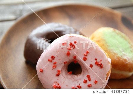 アカシアプレートに乗せたイチゴとチョコと抹茶のドーナツ