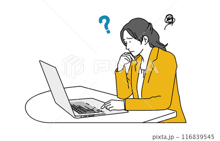 パソコンの前で考える女性社員のシンプルイラスト