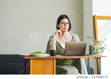 パソコン画面を見る若い女性 リビング ワンルーム