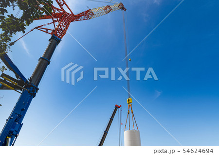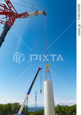 風力発電用風車の組み立て作業中のクレーン作業と送電鉄塔