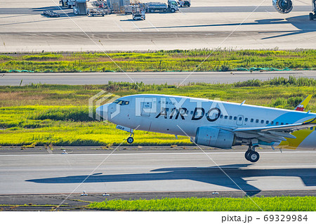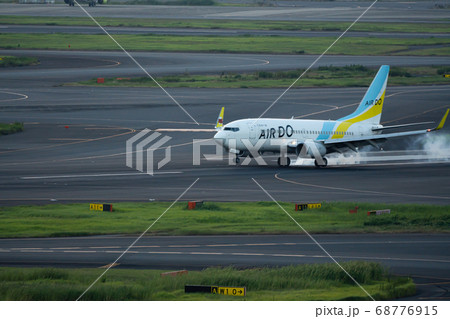 空港 飛行機 羽田空港 着陸 夕陽 夕方 午後 航空会社 エンジン ブレーキ エアドゥ