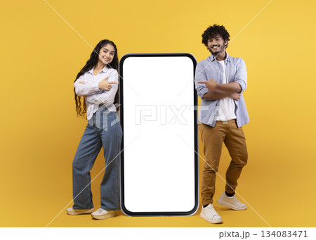 Young indian spouses posing near huge smartphone with mockup, promoting mobile app or website, advertising your service or product over yellow studio background, free space