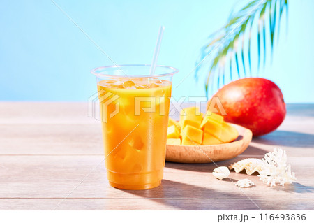 マンゴージュース テーブル板の上にプラスチックコップに入った冷えたマンゴージュース、後にアップルマン