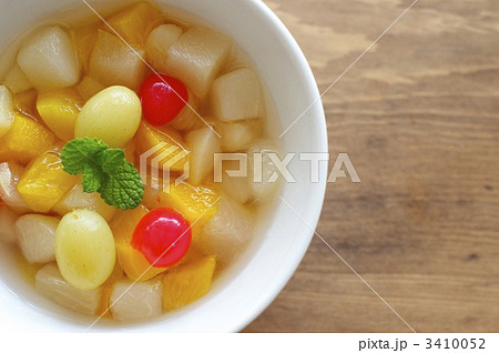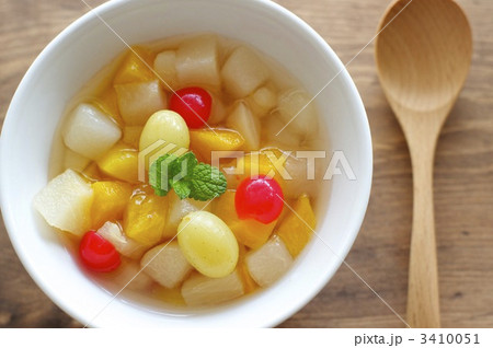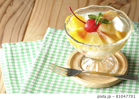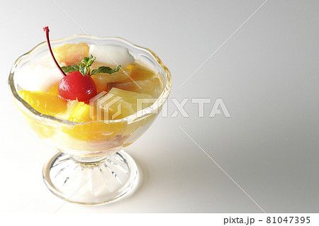 牛乳かんやパイン、マンゴー、白桃、チェリー、ミカン等のフルーツが入ったフルーツポンチを白背景で撮影