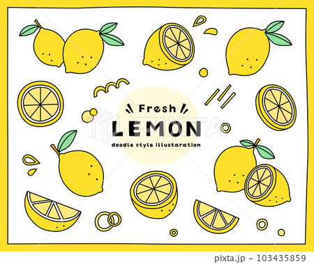 手書き風レモンのシンプルなイラストセット 果物 フルーツ 柑橘 夏 果実 ビタミン 檸檬 果汁 断面